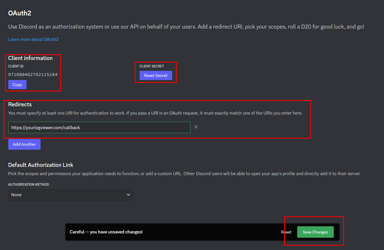First, copy the Client ID and Client Secret. You will need these later when filling in the .env. Then, set a redirect URL to https://yourlogviewer.com/callback, with the url being changed to the url of your logviewer. Finally, click save.