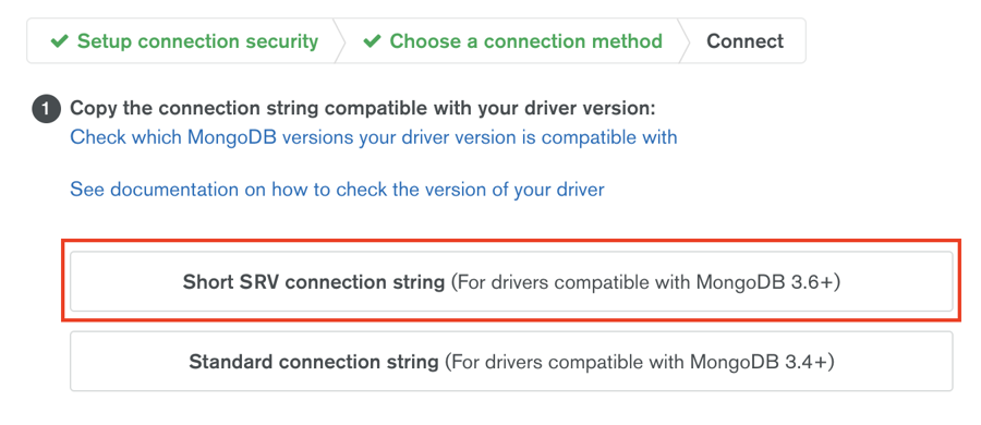 The last part is to generate a MongoDB URI, navigate to "Clusters" and click on "CONNECT" (as shown in "Getting Started"). From the popup, select the middle option "Connect Your Application", and then the first option "Short SRV connection string".