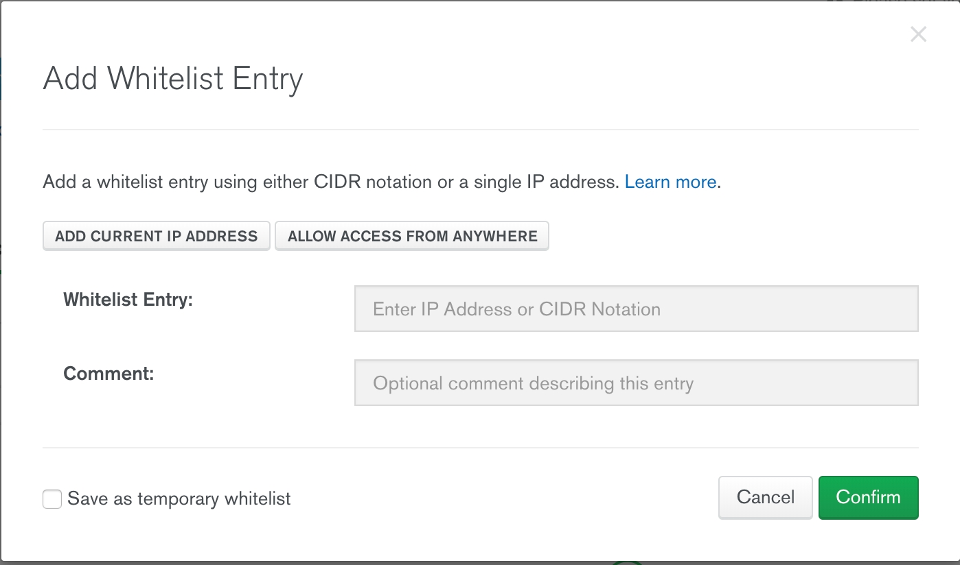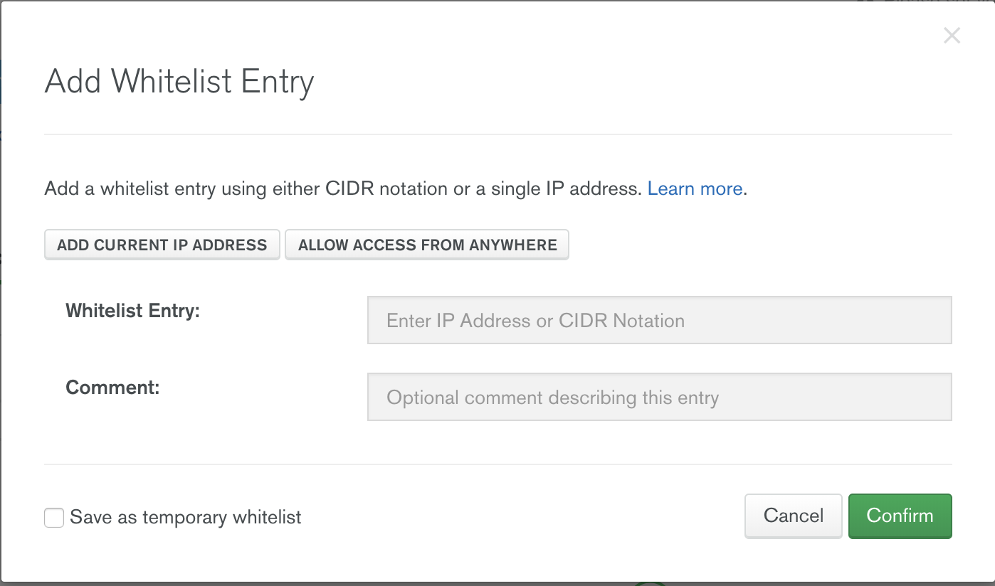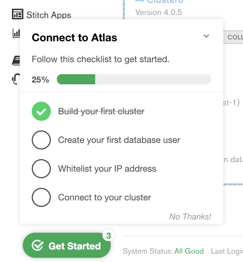 Follow the "Getting Started" tutorial on the bottom left, by creating a database user, whitelisting your IP, and connect to the cluster. When whitelisting you IP, be sure to select ALLOW ACCESS FROM ANYWHERE since Heroku does not grant a fixed IP.
