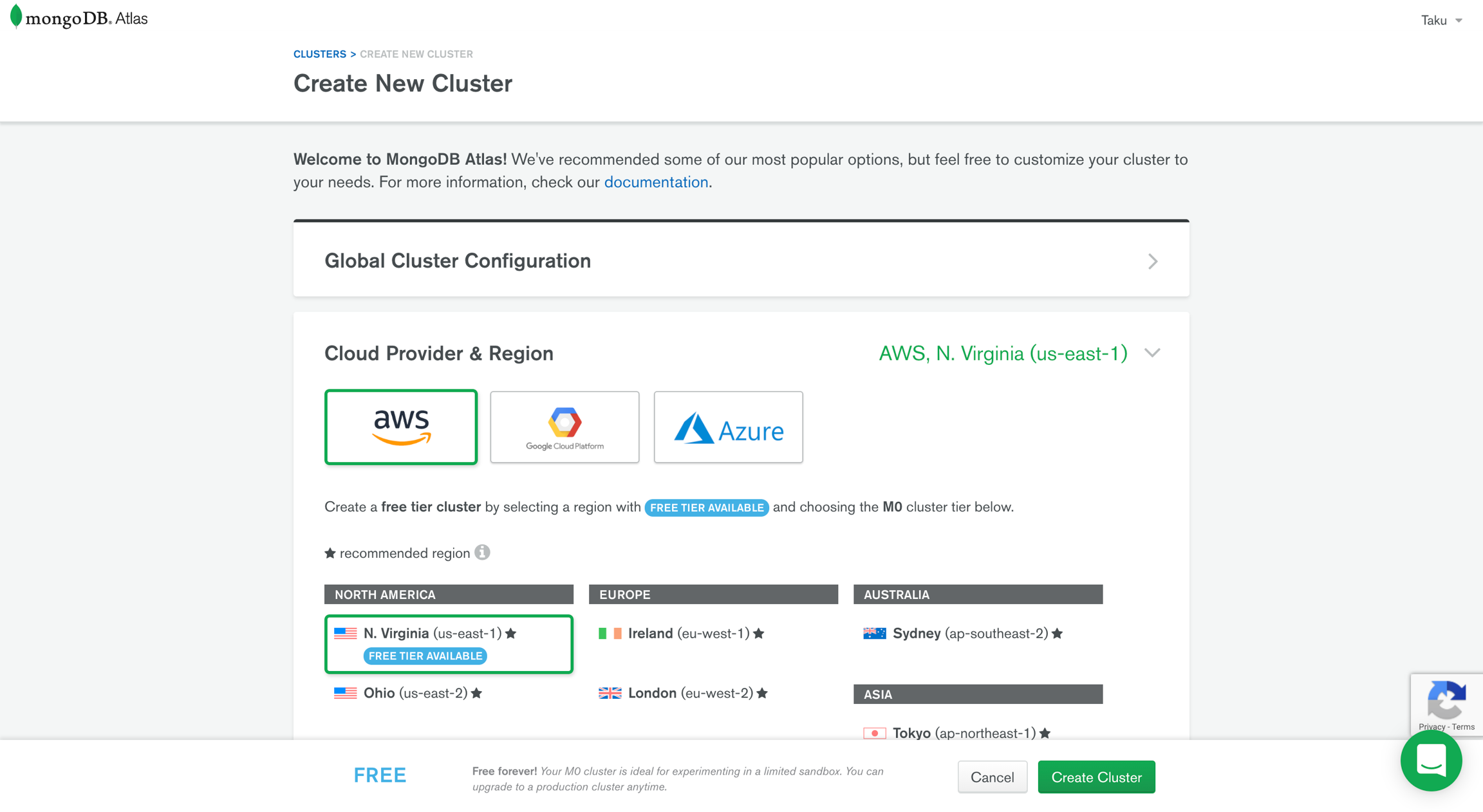 Select one of the servers marked with "FREE TIER AVAILABLE" for the free option and click on "Create Cluster".